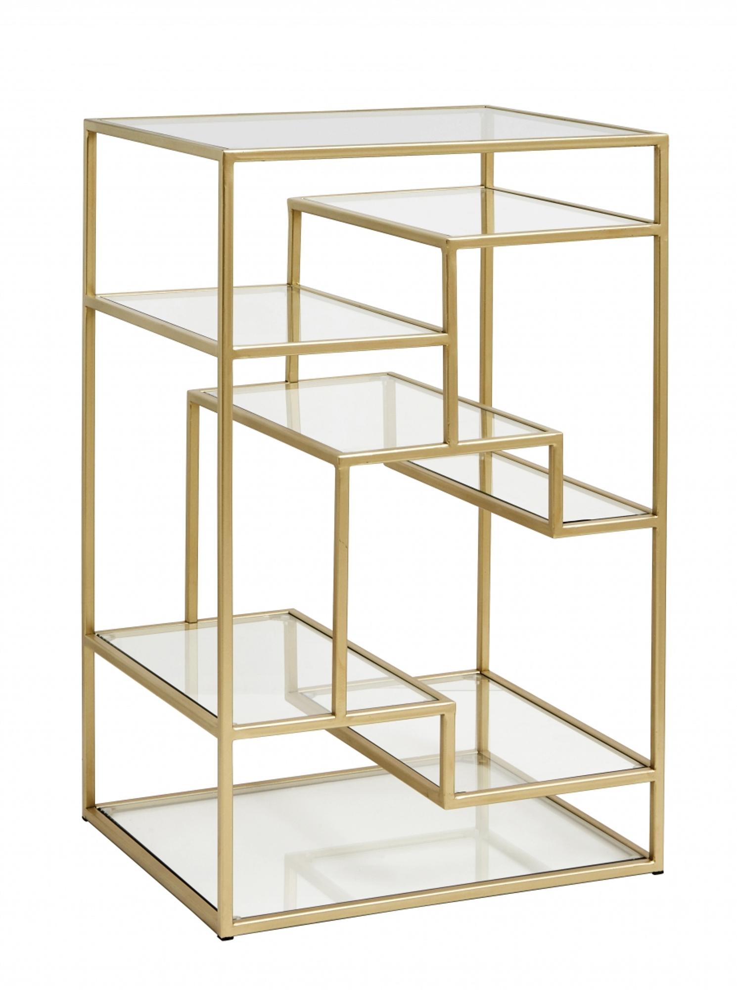 Dieses elegante Wandregal aus Metall und Glas verleiht jedem Raum einen Hauch von Luxus. Die goldenen Akzente verleihen dem Regal eine edle Note, während die Glasböden für eine moderne und luftige Optik sorgen. Perfekt für die Präsentation von Deko-Objekten, Büchern oder anderen Gegenständen.