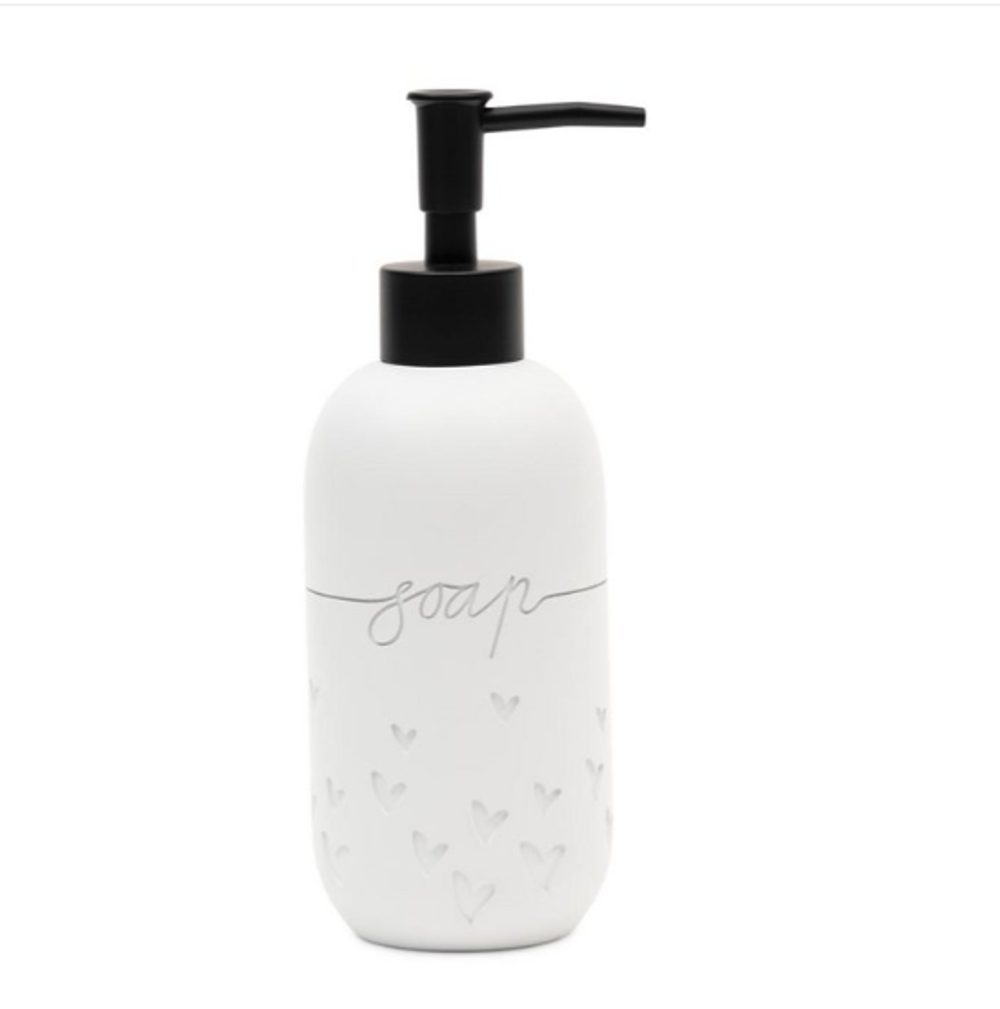 Der Lovely Heart Seifenspender ist ein weißer Seifenspender mit schwarzen Details und einer besonderen Dekoration.